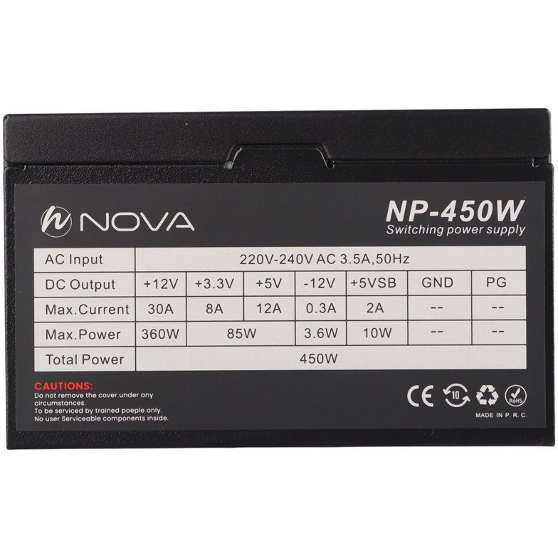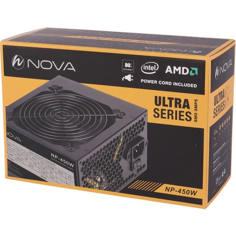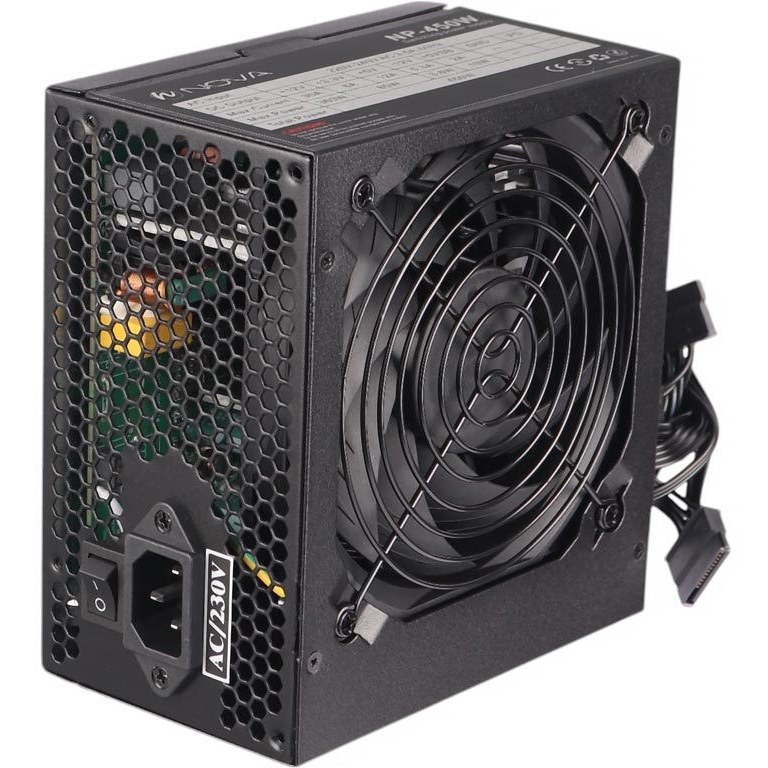 منبع تغذیه نوا مدل NP- 450 از نوع غیر ماژولار بر اساس فرم فاکتور ATX طراحی شده است، پاور نوا برای انواع سیستم ها با مادربردهای اندازه استاندارد مناسب می باشد. این منبع تغذیه با بهره بردن از متریال و قطعات با کیفیت و استانداردهای حفاظتی OVP ،OPP و UVP، امنیت قطعات داخلی سیستم را تامین می کند. اتصالات این منبع تغذیه شامل دو عدد کانکتور IDE، چهار عدد کانکتور SATA، یک عدد کانکتور ۴+۴ پین و یک عدد کانکتور ۲+۶ پین و یک عدد کانکتور ۴+۲۰ پین مادربرد می باشد. یک فن ۱۲۰ میلی متری نیز بر روی این منبع تغذیه تعبیه شده که فرآیند خنک سازی و متعادل سازی دما را به خوبی اجرا نموده و از آسیب ناشی از فشار بار اضافی و گرمای بیش از حد به قطعات داخلی جلوگیری می کند.